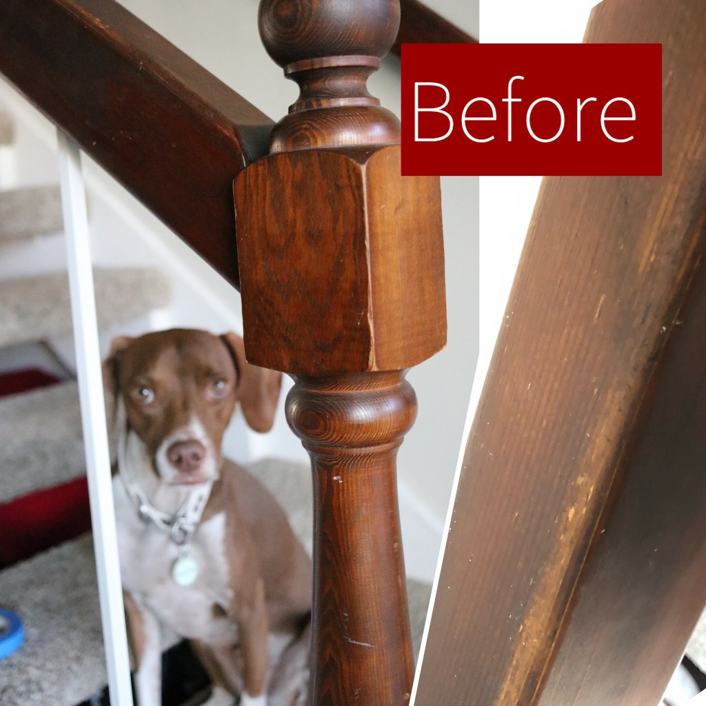 Step 1: Use cleaner and paper towels to scrub the stair railing. I did sand off a little paint that was on the stairs, but wiping the stairs down and letting them dry is all you really need to do before you start this project.