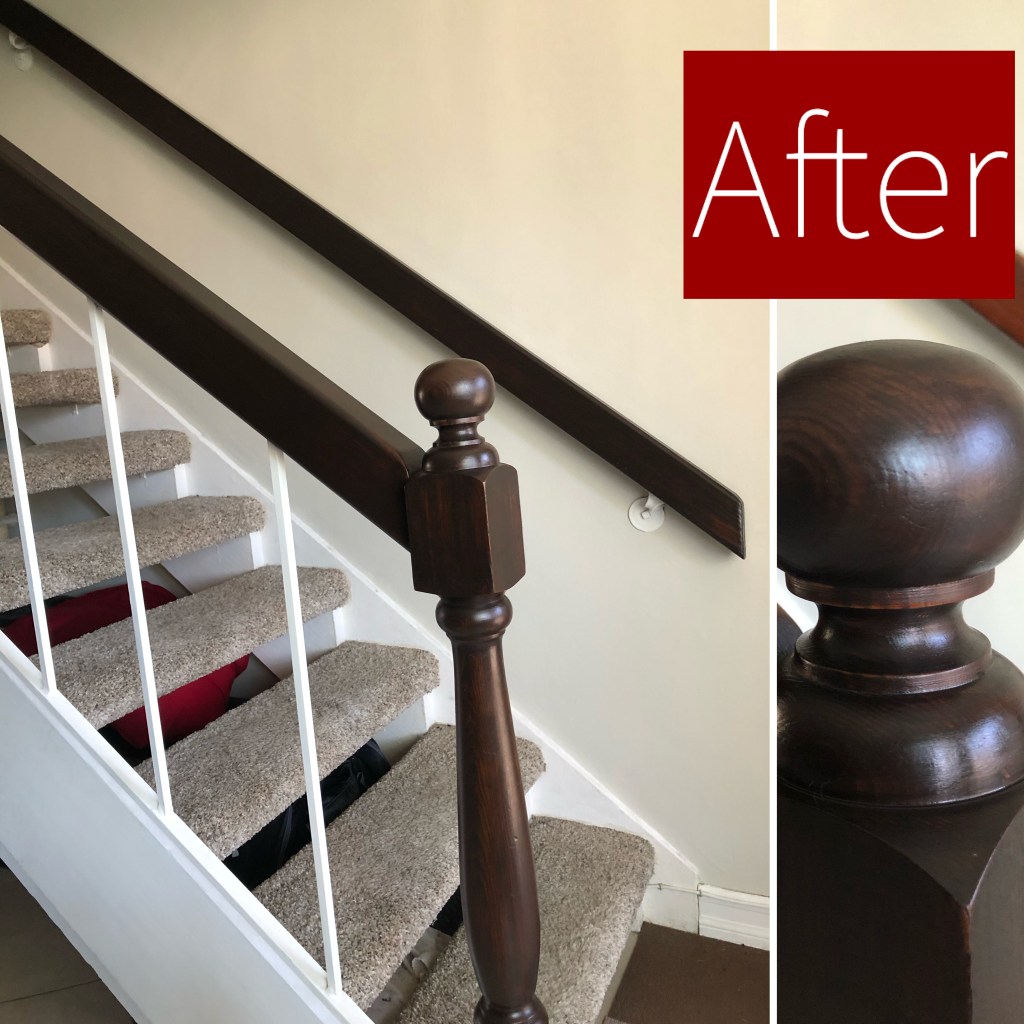 Step 4: When I completed the stair railing in full, I waited a half hour, then went by with a rag again just to make sure I got all the excess off. It did pull some more stain off in some areas so I was glad I did that.